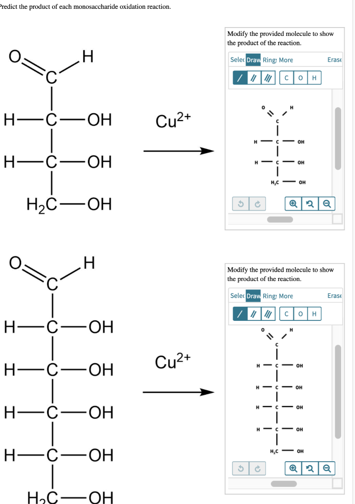 Modify the molecule to show the product of the reaction. Predict the product of each monosaccharide oxidation reaction. Up to 256 cash back Sapling Learning Predict the products of the following monosaccharide reactions.